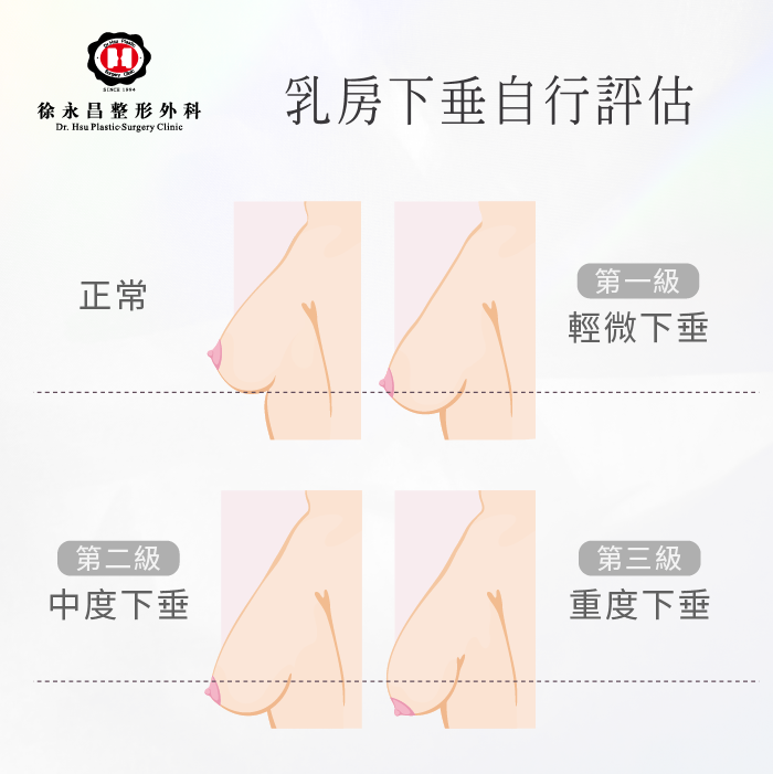 不管是平胸或是大胸部,肌膚都會隨著年齡增加,滿滿鬆弛與下垂,加上天生如果乳房較大、重量較多的女性,下垂的幅度與嚴重性更會加劇。徐永昌醫生現在就教你如何自我檢胸部下垂的級數吧!