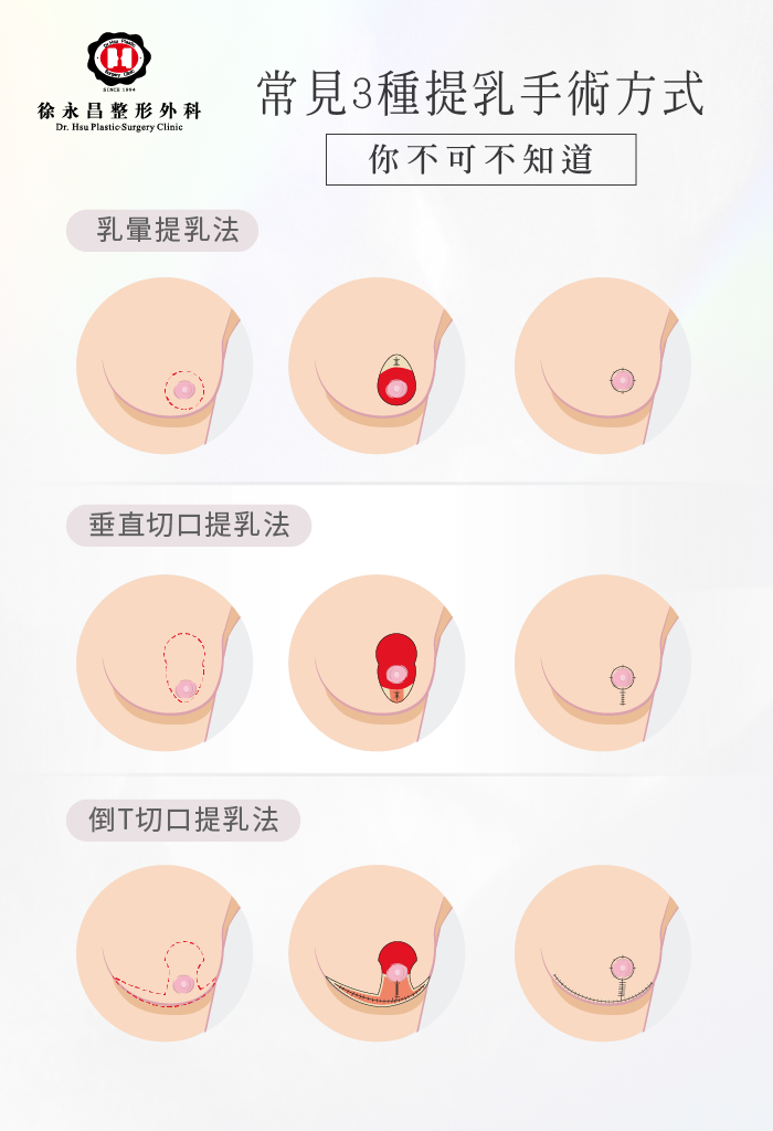 從上述的描述中,可以知道不同下垂程度的胸部從輕微到嚴重的程度,分別可以適用的提乳手術為乳暈提乳法,再者乳暈提乳法,更嚴重的下垂則是倒T切口提乳法,當然提乳手術因為切口較大、疤痕也較明顯,建議患者可以日後透過除疤凝膠或是雷射來改善疤痕的色素沉澱。